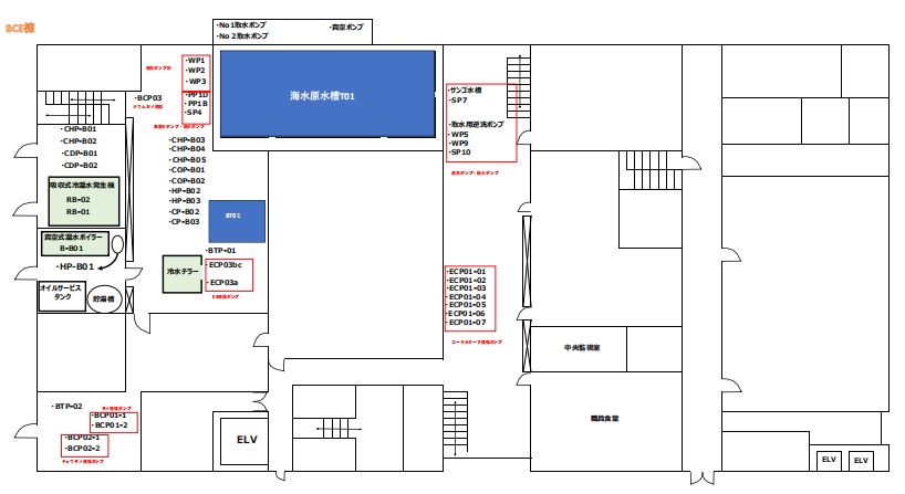 海水原水槽(T01) c:貯水槽 2025.10.21 海水原水槽T01はBCE棟1階にある900tの貯水タンクで、当館の海水のメイン貯水タンクです。 海水取水ポンプ(KSP01/KSP02)によって水族館沖の海から取水しており、海水取水ポンプ→海水取水濾過器→海水原水槽T01の経路で貯水されます。 本タンクに海水系の各サプライポンプ・逆洗ポンプなどが接続されています。 海水取水系の概念図