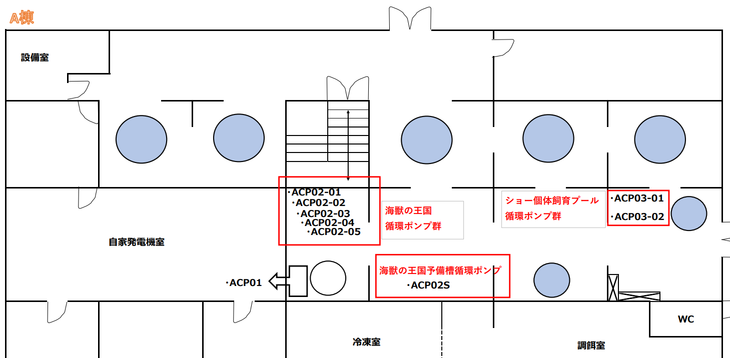 A棟循環ポンプ一覧(ACP) 02:A棟区画 2025.10.21 A棟1階には、循環ポンプのACP01(ショープール)・ACP02-1/2/3/4/5(海獣の王国)・ACP02S(雑居予備槽)・ACP03-1/2(ショー個体予備槽)があります。
