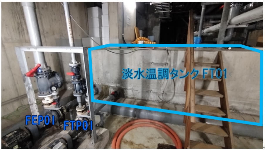 淡水温調タンク(FT01) 04:DF棟区画 2025.10.21 淡水温調タンク(FT01)はDF棟にある淡水貯水タンクで、加温した淡水を貯めておくことが可能です。 通常は本タンク用の熱交換器つき循環ライン(FEP01循環ライン)で循環・加温されていますが、各水槽への補給時には温調水供給ポンプ(FTP01)を使用します。 なお、本タンクへの自動給水システムはなく、貯水量が減るたびにWP24を使って手動補給する必要があります。 淡水取水給水の概念図