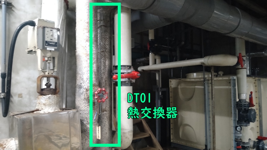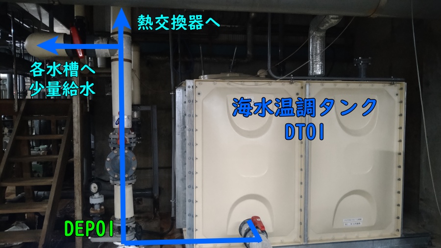 海水温調タンク(DT01) 04:DF棟区画 2025.10.21 海水温調タンク(DT01)はDF棟にあるパネルタンクで、冷却した海水を貯水しておくタンクです。 本タンクには循環・冷却用のポンプDEP01が設置されており、その循環ラインにはブラインチラーの熱交換器が組み込まれています。 また、DEP01の循環ラインから、D8/D9/D12へ向けて少量の冷水補給水が送られています。