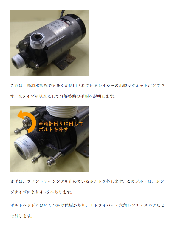 軸(シャフト)が貫通しておらず、モーターの動力を磁力を介してインペラ部分に伝導しているため、飼育水がケーシング内で完全に密封され液漏れを起こさない=保守管理が非常に楽です。反面、マグネットの磁力には限界があるため大容量の流量は送れません。