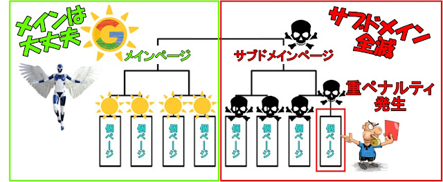 ペナルティーを受けやすいカテゴリーとしてはYMYL(ユアマネー・ユアライフ)が有名で、資産運用や健康医療に関するコンテンツはメインサイトとは違うサブドメインで扱うのが無難です。このほかにも、販売コンテンツ・誘導コンテンツ・広告コンテンツなどもペナルティー対象になりやすいカテゴリーです。