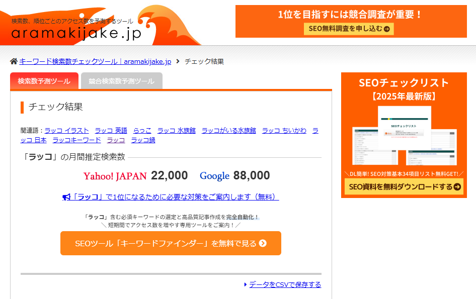 検索ボリュームチェックツールを使用すれば、各キーワードの月間検索数の推測値を知ることができます。