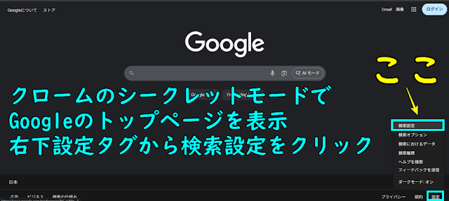次に、Googleのトップページに行き右下の「設定」タグから検索設定をクリックします。