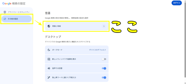 その他の設定タグから「言語と地域」をクリックします。