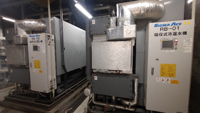 冷温水発生機(RB-01/RB-02)はBCE棟一階にあり、夏期は冷水を、冬期は温水を作っています。