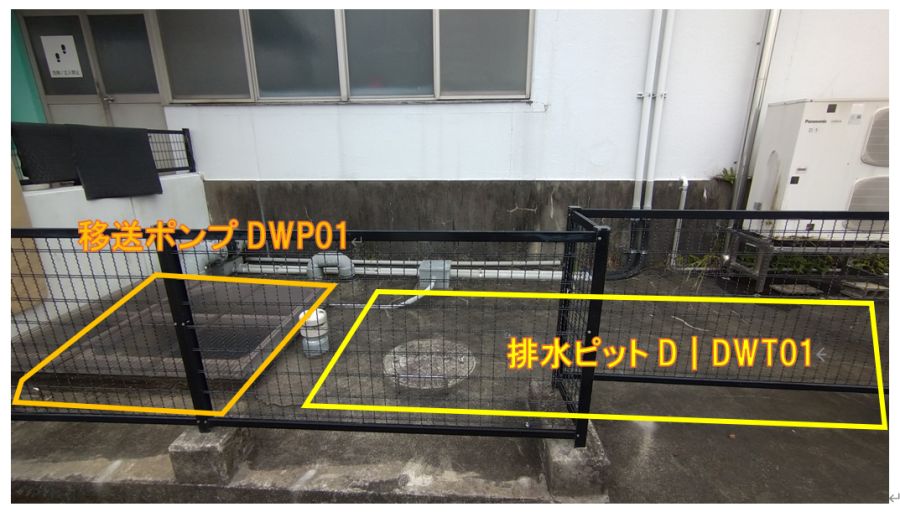 排水ピットDはDF棟の重力式逆洗排水を一時的に貯めるための地下タンクで、DF棟海側の処置室外側にあります。